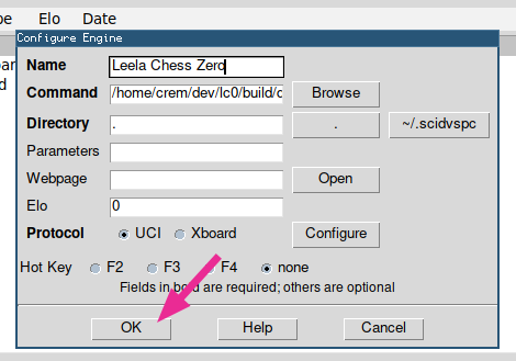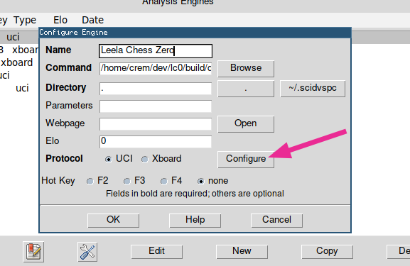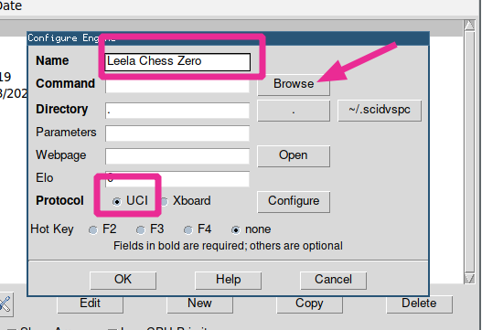 1. Choose a name to use for this engine, and type it into the “Name” field. Select UCI as the protocol. After that, click “Browse” to find the Lc0 binary: