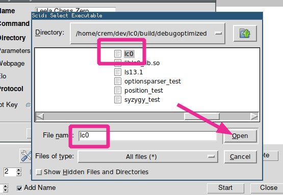 1. Find lc0 file (or lc0.exe if you are in Windows), and click “Open”: