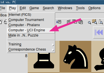 1. Or if you want to play against it, go to Play → “Computer - UCI Engine” menu item: